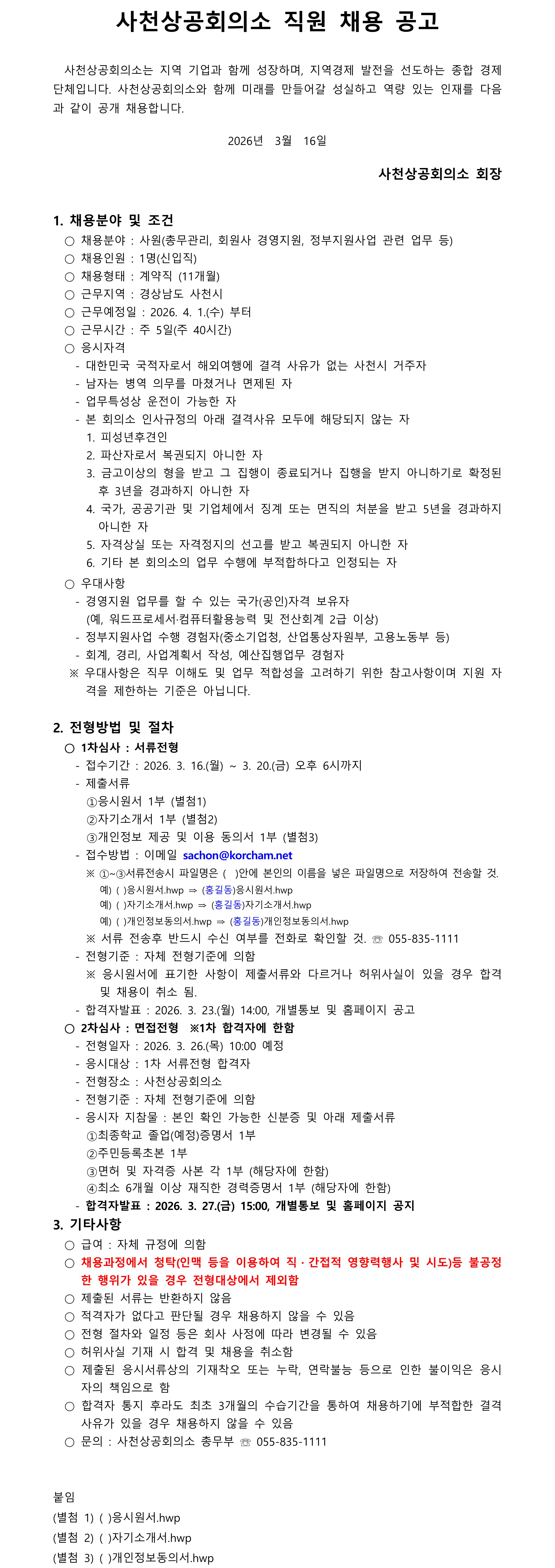 | ‒ | 사천상공회의소 직원채용 공고 |