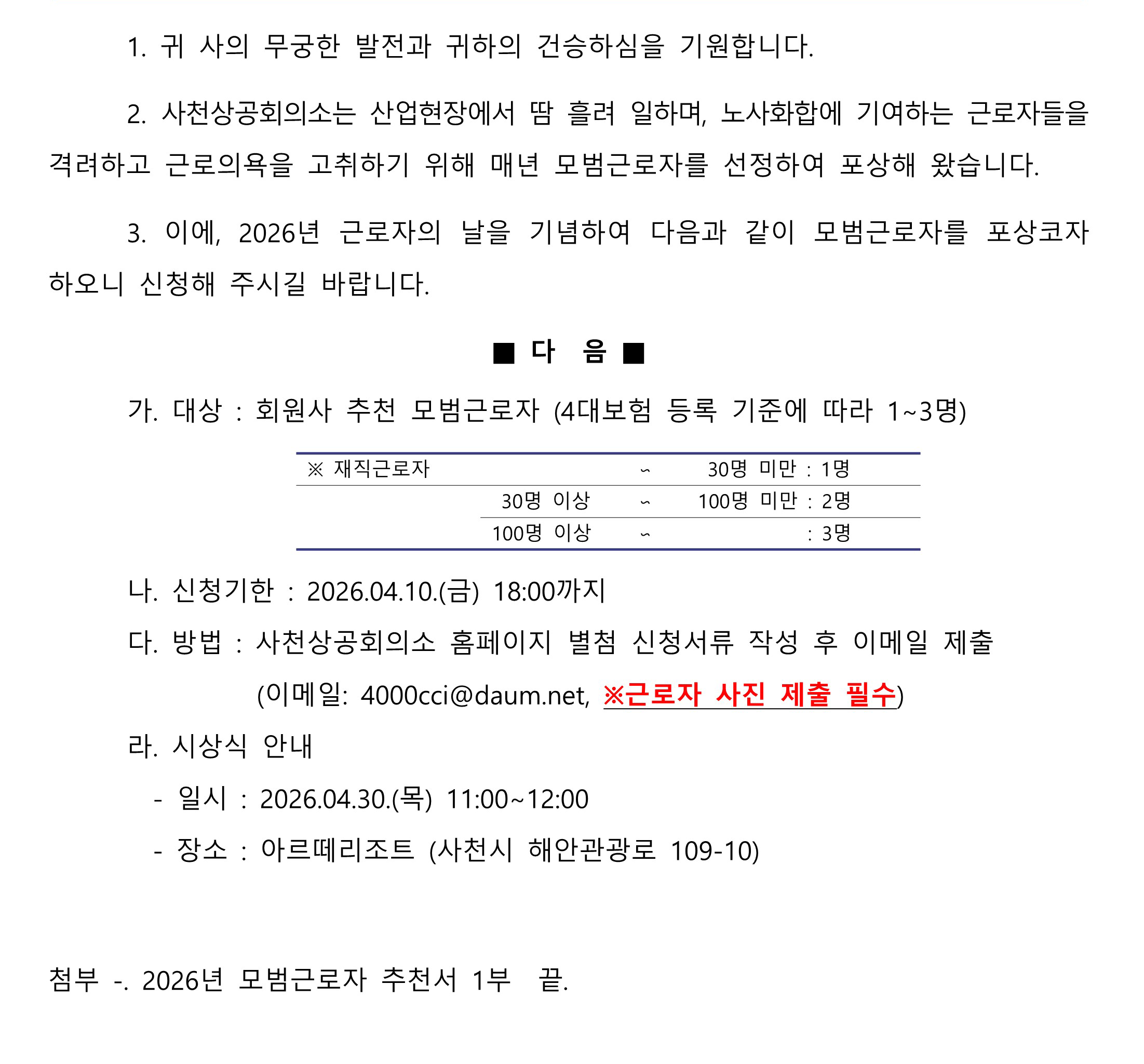 | ‒ | [사천상공회의소] 2026년 근로자의 날 기념 모범 근로자 표창 안내 |